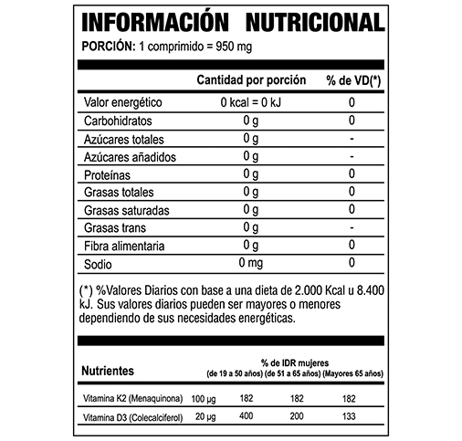 Suplemento dietario a base de Vitamina D3 y Vitamina K2 (menaquinona-7). Contribuye a la salud ósea, dental y cardiovascular evitando la calcificación de las arterias.